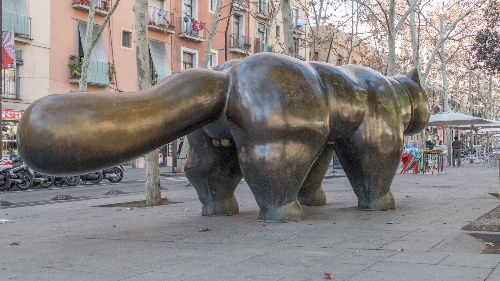 We left the house and headed for “El Gato,” a giant cat sculpture that has somehow captured my imagination enough to be a photographic destination. We remember to stop for a bocadillo. We eat cheese sandwiches and café Americana in a charming patisserie and rest our legs. We climbed more steps today than we have in months.