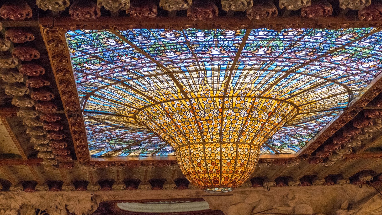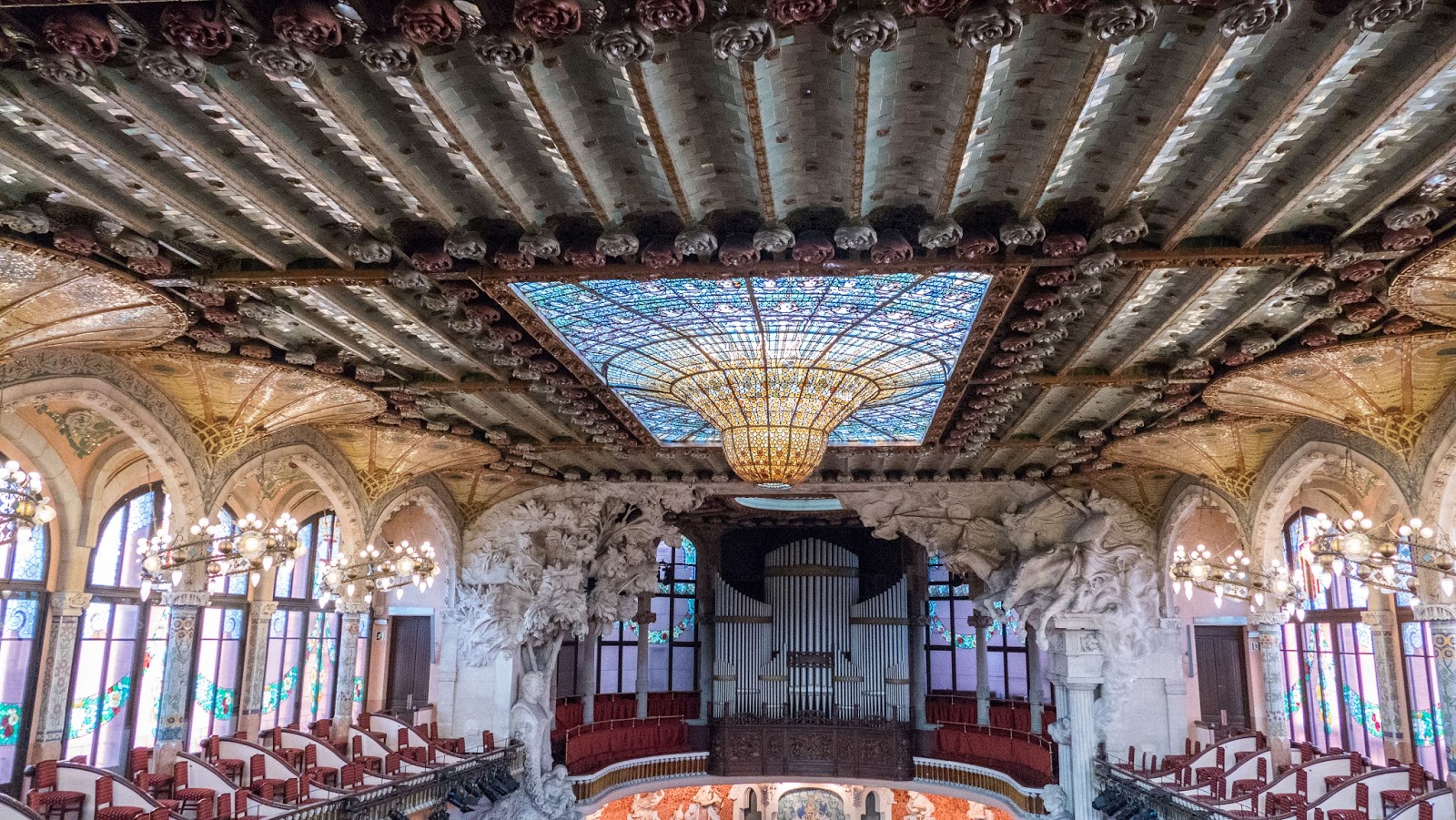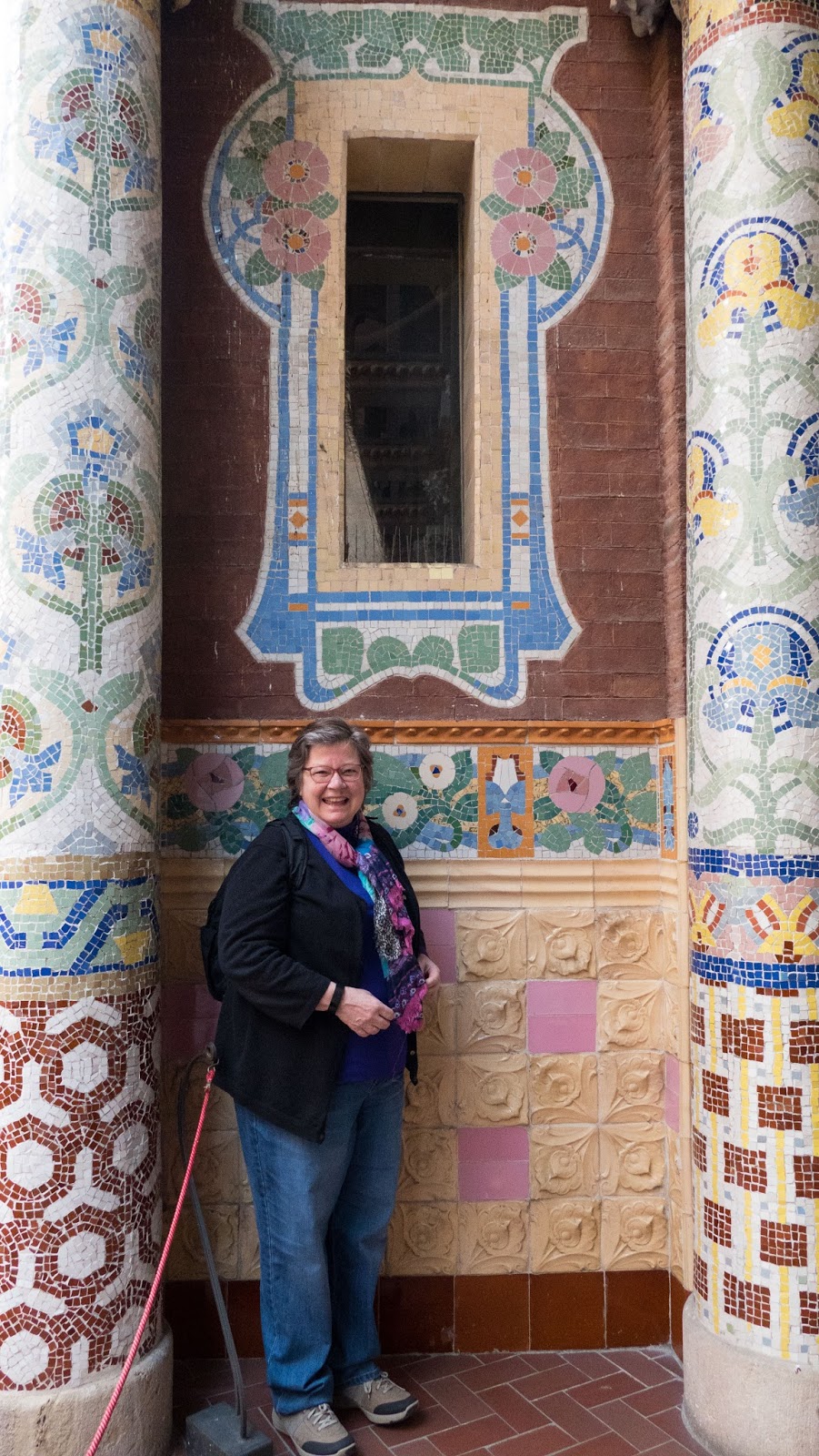 This AM I saw a bus and just started running. Now I don’t have the lungs or breath to run but damn if I am going to slow down this adventure. Lorena gets on after me and we plop down breathing hard. “Is this the V13? “ Hell if I know, I thought Lorena indicated to get on. I felt terrible that we were on the wrong bus and then bang- it is the V15 which is actually the correct bus. Who knew we needed the VA 15 all along? This is the magic of traveling. You try and control things but there is so much left to chance when you half understand what is going on. It shines a light on how little control you have. It makes me laugh. There are several basic BCN sights we have somehow missed along the way, and the Palau de la Música Catalana is one of them. This late 19th century Modernista extravaganza was designed by Lluís Domènech i Montaner, one of Gaudí’s contemporaries, and the same architect that designed the incredible public hospital (now museum) of Sant Pau. Barcelona’s “Modernista” aligns with Art Nouveau, and predates the more minimalist abstractions of Picasso and other modernist artists. Its pleasure for me comes out of its excesses. For me it aligns with camp sensibility or with rococo.