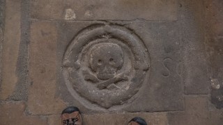Our first errand was to buy some sausage for a meal. The store was as much a destination as the meat. It’s across from this elegant square and church, María del Mar. We took a turn through the church, marveling at the carved flagstones. I thought it might mean patronage—donations made in others’ names. Kitty thought there might be people buried under there. Either is possible. A Momento Mori either way.