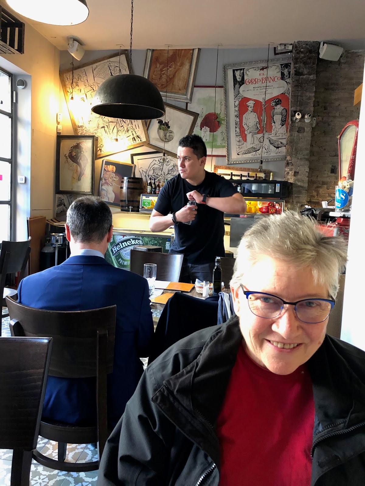 One of the wonderful things about Barcelona is the “Menú del Día.” On our food tour last year we were told that that Franco insisted that restaurants must provide a reasonably priced menu for the “working man.” [Lorena notes that this practice is common throughout Europe and hesitates to give Franco credit for anything]. This menu includes two courses, bread, beverage and sweet. There is a Catalan restaurant on the street level of our apartment building, “Al Grano Mercat.” The menu of the day is 11 EUR (12 USD). I get Lorena to take a picture of the day’s menu and go up to our apartment and translate before we descend below to partake. Even with the prep that are surprises. Lorena picks the what I thought was regular pork and it fried pig’s belly is in a black bun with two sauces: done sweet and the other mustard. My grilled smoke vegetables are wonderful. I get a chicken thigh with yuca, and Lorena a beefsteak with carrots and broccoli. All beautiful prepared. But the real star was the dessert, Tiramisu. What delight. The whipped cream was stiff and rich, the coffee’s flavoring on the layer cake was intense. Somehow different but familiar. The staff were proud and attentive. We left inspired to put in a review on Trip Advisor. I declare ”we could eat here every day!” but Lorena is hesitant to commit to this plan.