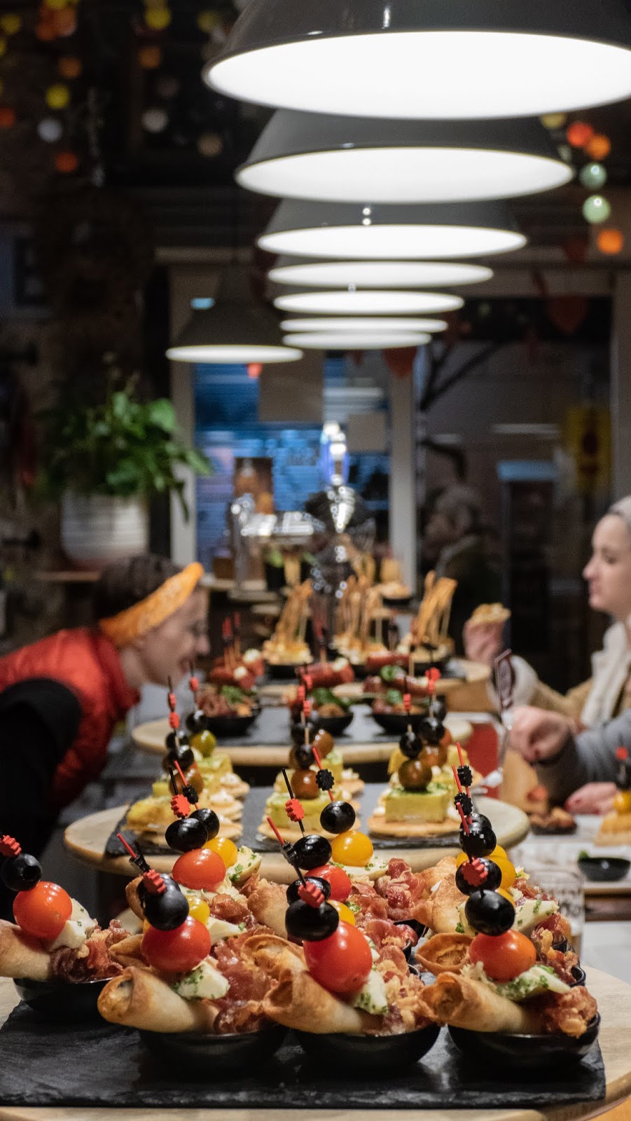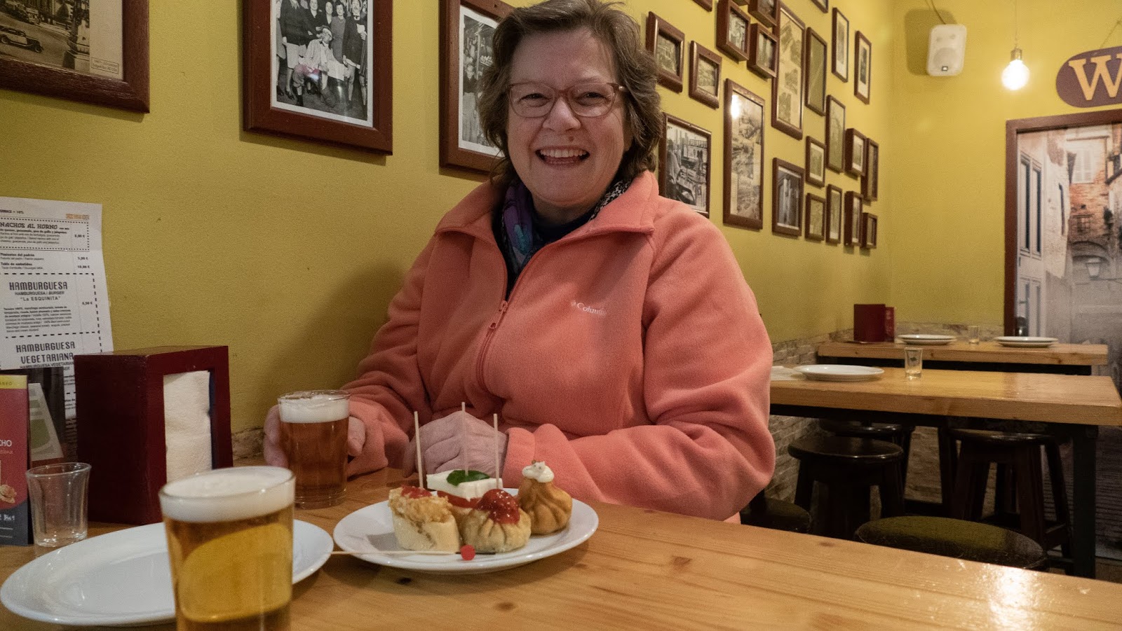 The Tapas bars have always been intimidating. Tons of people and competition, not clear what to do, always hard. Well we arrive plenty early and this kind waitress takes us under her wing. “I will tell you what to do.”