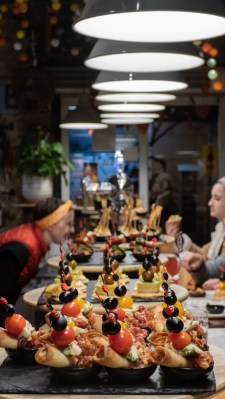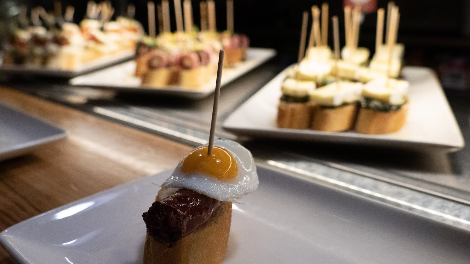 The tapas all have toothpicks, the white ones are the cheaper and the colored ones are more expensive. Well of course I want all the colored ones. I start out very timid, barely able to peruse the choices.