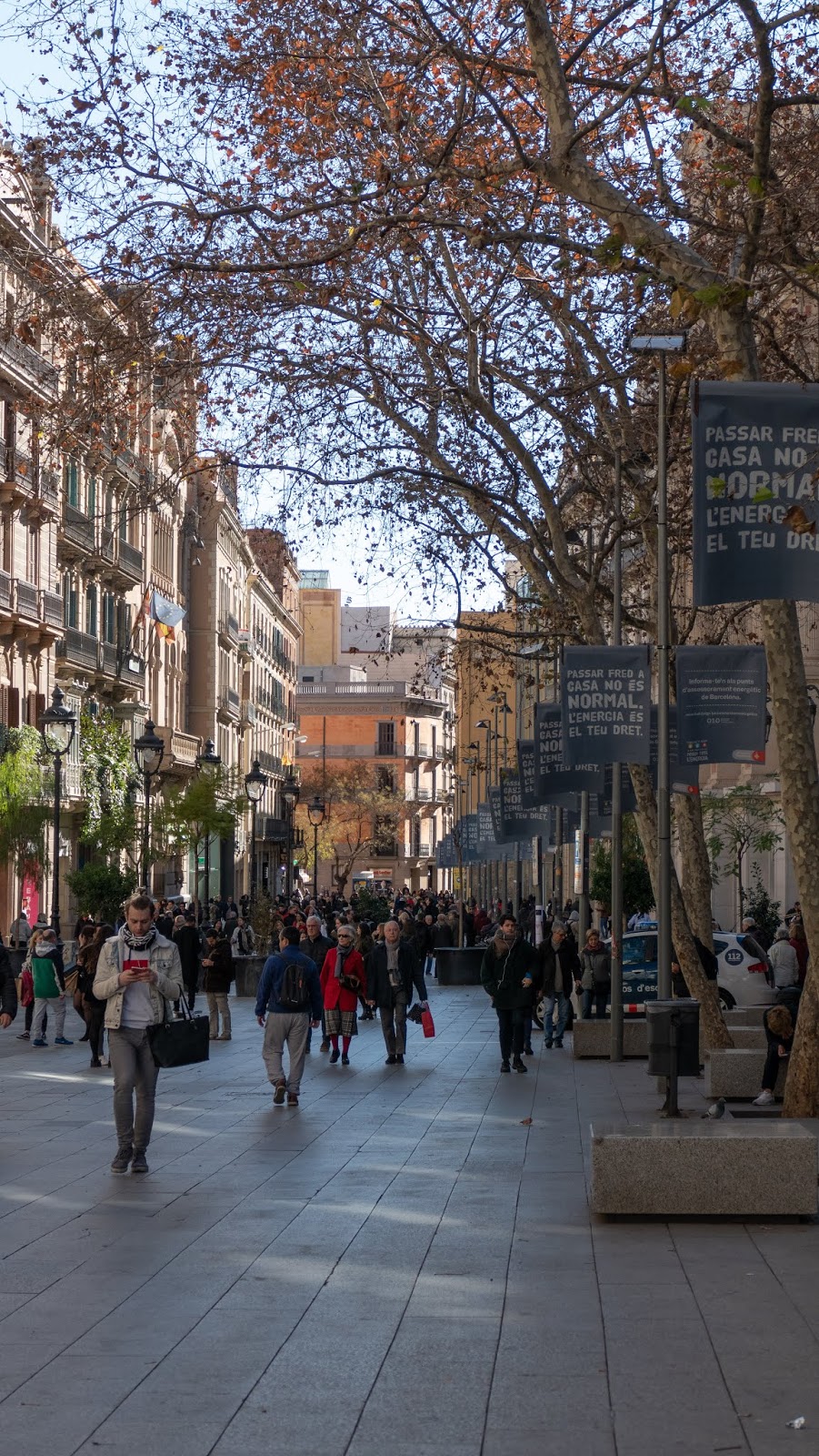 It’s a beautiful day, though it’s cool when the breeze blows and you’re in the shade. We head down Grácia and walk through Catalunya square and down the pedestrian street, Ave. del Portal de l’Àngel. We realize we’ve never been able to enjoy this area before because of the crowds. There are still lots of people but not the suffocating numbers. We stand and watch some good buskers playing horns, and the buildings are beautiful.