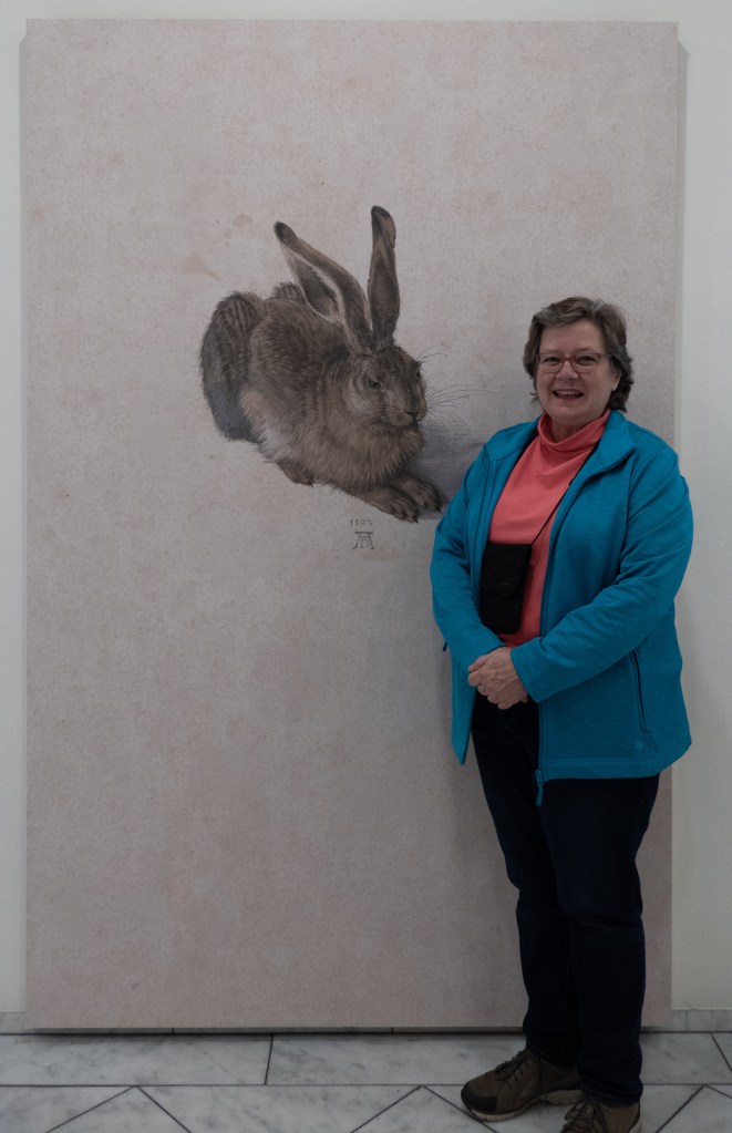Next it’s onto the Albertina to see a Dürer exhibition . Thanks to our friend Bob for alerting us this one. Amazing sense of detailed realism for engravings. The rabbit is the star, but I enjoy the rhino and his portraits as well. And then works like “Melancholia” and “Saint Jerome” that I’ve studied but have never seen. It’s hard to get close as people are so avid (one woman has brought a magnifying glass to see the rabbit’s hairs and the guard has to ask her to move back and move on). There’s one portrait of “an African” that is rendered tenderly (one of about 5 black people we’ve seen in Vienna) and another of an 18 year-old boy. Of course there’s more to this museum (used to be a palace) than Dürer. We are introduced to an Austrian artist, Maria Lassnig, and enjoy their collection of Monet, Cezanne, Picasso. Nice groupings to show various movements.
