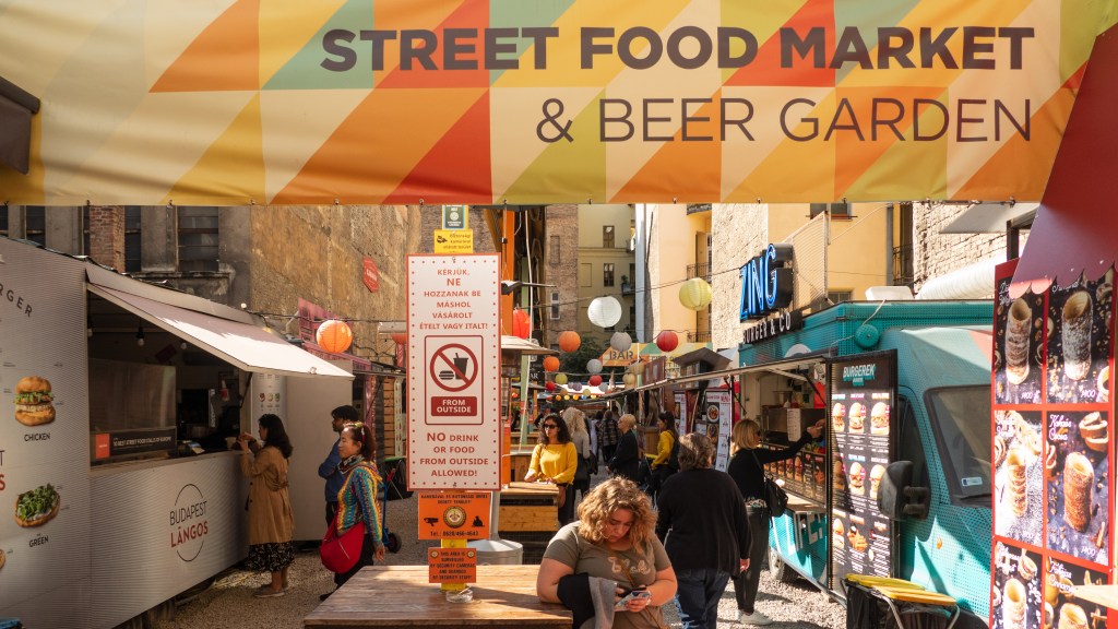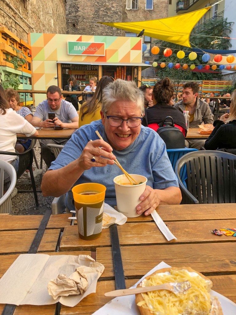 We head back to Kaczynski Utca and the food truck court, “Street Food Karavan Budapest.” There are lots of choices for lunch, everything from fried chicken to barbeque to hamburgers to vegan. I opt for curry and Kitty settles on a lángos, traditional Hungarian open-faced sandwich with garlic, shredded cheese and sour cream on deep fried dough. The Thai red curry is very hot, but delicious.