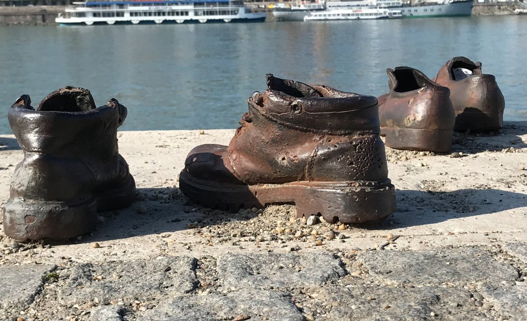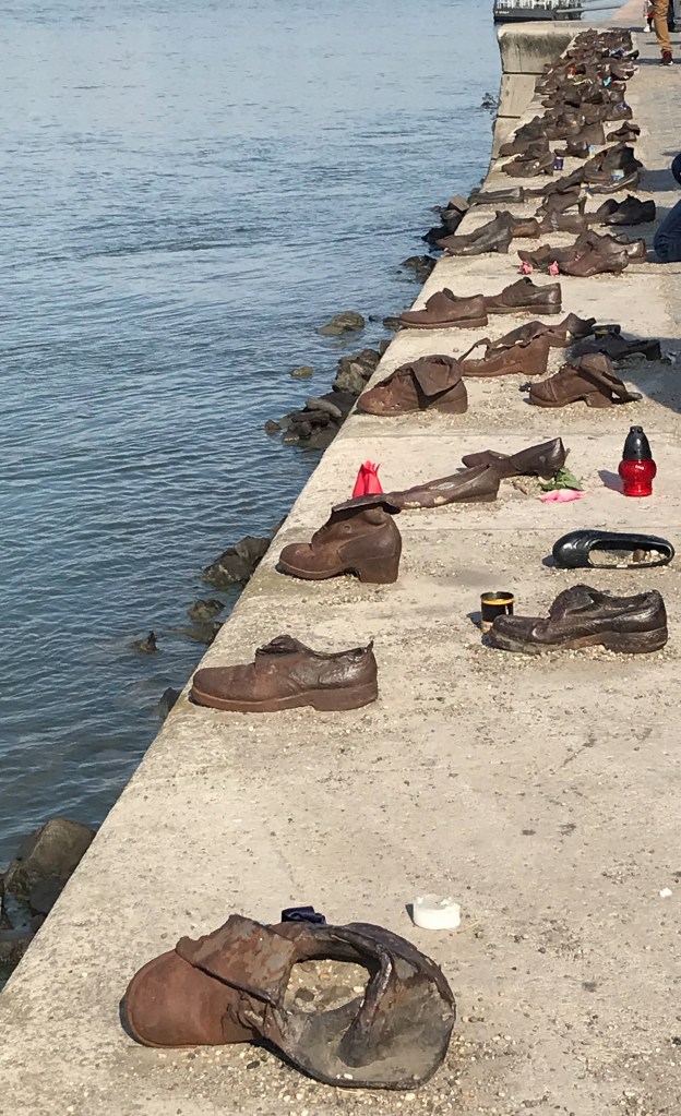 The “Shoes on the Danube” is a 2005 installment of 60 pairs of realistically rendered iron shoes in remembrance of the many Jews who were killed by fascist militia during the war. They were routinely lined up, asked to off their shoes, and then summarily shot so the river would carry off their bodies (Wikipedia). It’s a dark start to our day.