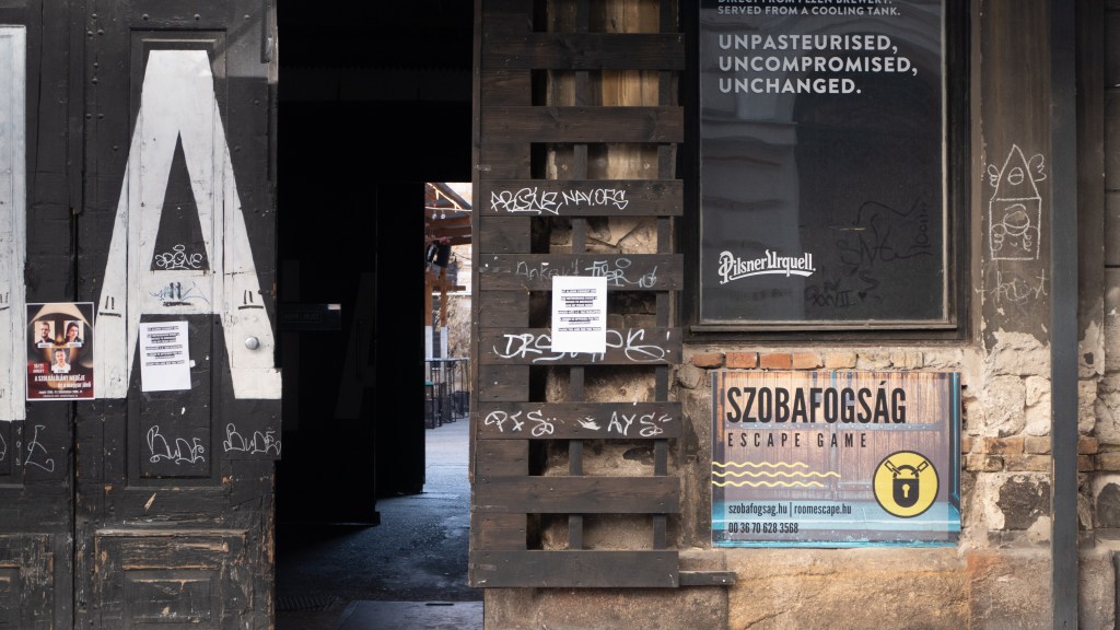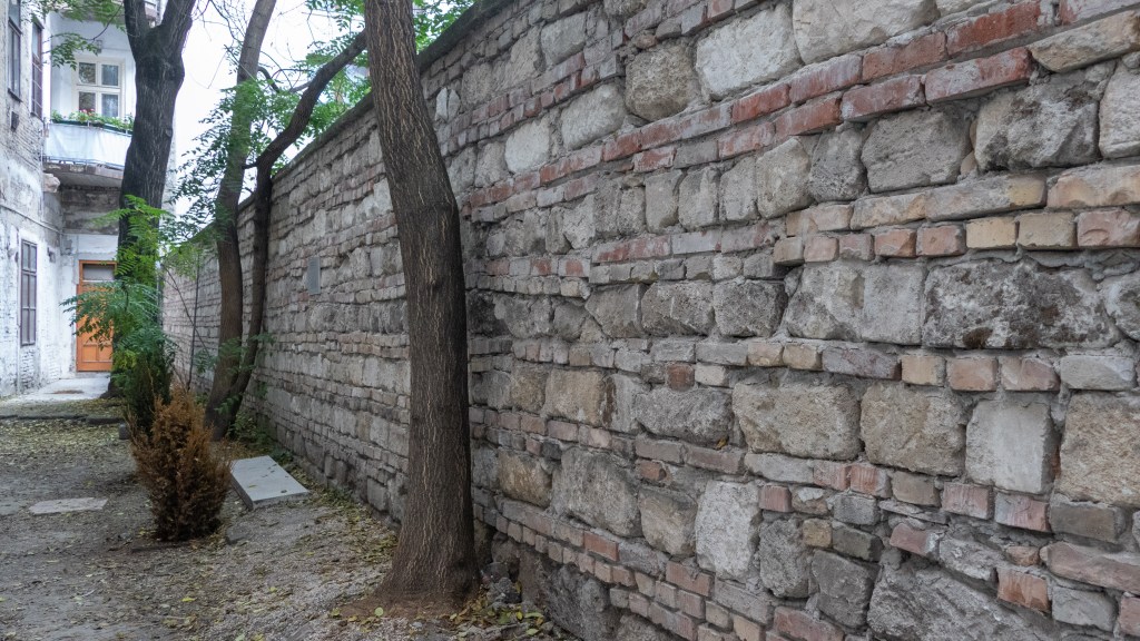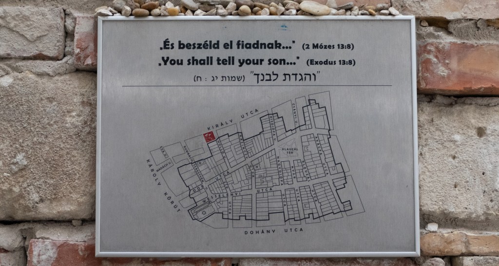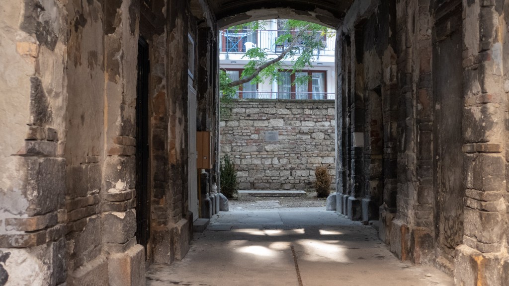 I had read about a fragment of the 1940’s ghetto wall that was just around the corner. We find the entrance just off of Kiraly Utca. There’s no sign or indicator on the street. If I hadn’t researched this we never would have ventured into the unmarked, dark and decayed courtyard. There’s a plaque marking the wall, and low-rent apartments surrounding it. It’s an appropriately somber place.