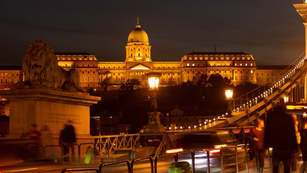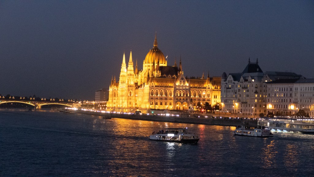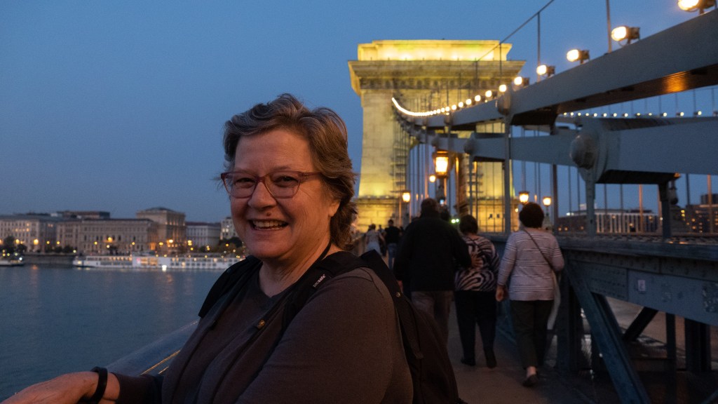 We take a break in our apartment following that meal. I have enough time to edit photos and get a start on the blog before we head out again at sunset. In the main square where we are meant to get on the bus traffic is cleared by an extensive motorcade with police escort. They’ve just had an election, so we imagine it’s the new President, so some comparable dignitary. Once the bus finally comes, it is slow going in rush hour. We get off the other side of the chain bridge, and it’s a beautiful evening, very romantic. We watch the sun set and the blue hour, then the lights go on all around us: the bridges, the Parliament, the cathedral, the castle, all are set aglow against the blue of the Danube. Lovely.