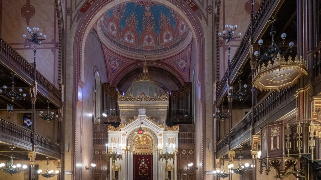 It was beautiful inside and out, with Moorish touches. Interestingly, though, it was designed by a gentile Austrian who modeled it on a Christian cathedral, right down to an organ (never played these days, although Franz Liszt inaugurated it in the 1860’s). They sat us in groups inside the temple according to language, so we looked for the English flag and took our places.