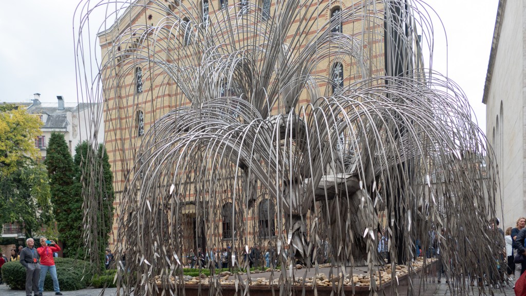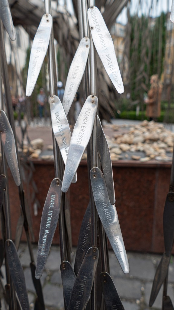 The tour guide was good. Kitty noted his excellent pacing and humor. He offered history and context while we sat, and then took us outside to the mass grave memorial garden and sculptures. There was one that represented the “Death March” our Israeli friend mentioned in his story last night. There is also a willow tree with leaves bearing the names of the thousands who died. I feel as though every day we learn a bit more of the history and the sorrow builds with every lesson.