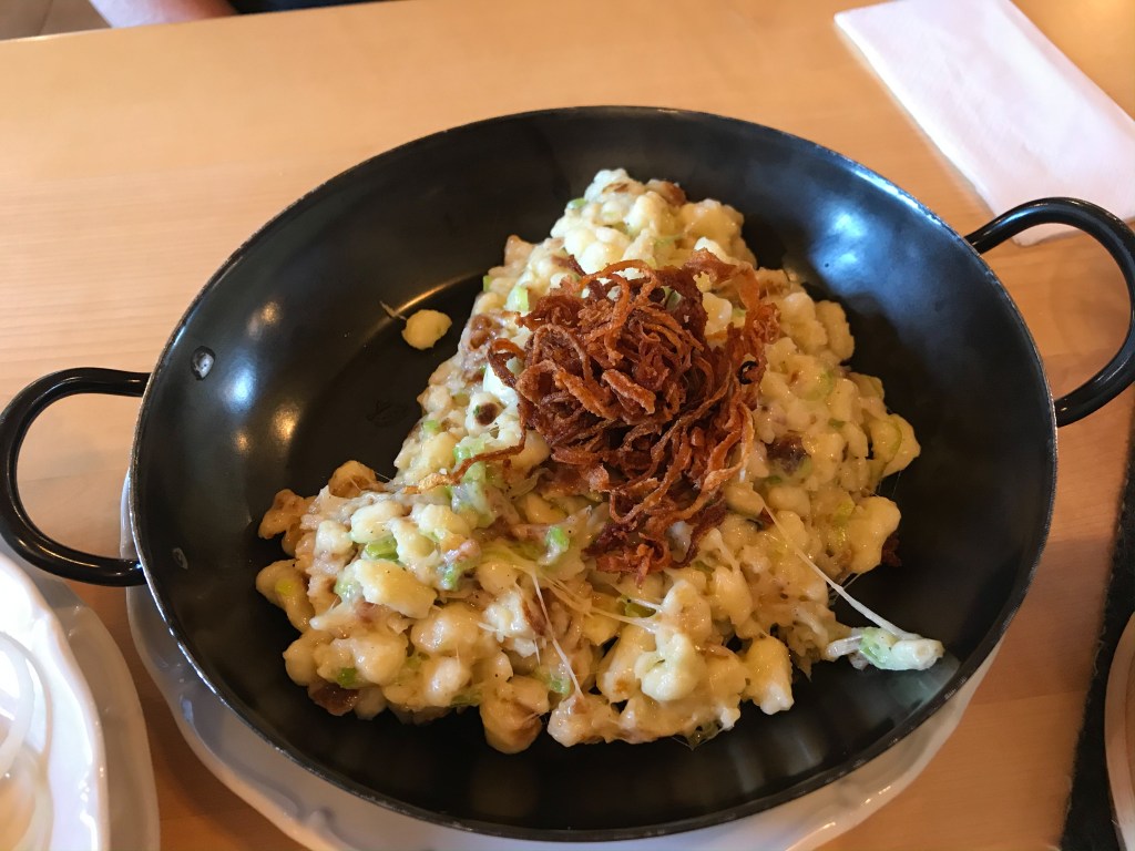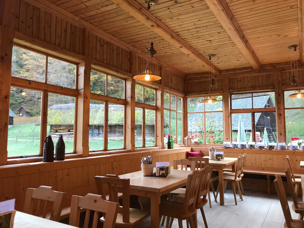 We come upon a restaurant straight out of Brothers Grimm. We stop and have a lunch of “Käse Spaetle” (cheese on noodles/pasta) and a green salad with beans I would call “big ass beans.” I think they are a variety of fava beans that I have seen in Spain but not at home. The salad was beautifully dressed with the pumpkin seed oil that is so popular here. A group of school children arrive outside. They squeal, scream with glee and run with abandon in the yard. I enjoy it for a while, but then I am glad to leave and continue our hike up the valley. Luckily, the group of children did not follow.