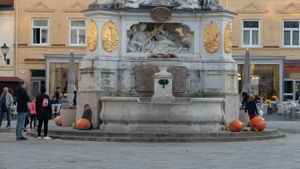 We end up having a great lunch—I get gnocchi and Kitty a chicken and vegetable noodle stir-fry. We even split a desert. We have a perfect seat in the main square. I enjoy watching the people and the dogs. One looks just like a young Sebastian. The town is decorated with hundreds of pumpkins and gourds and there’s a decided holiday feeling. Baden is a very quiet and peaceful town surrounded by wooded mountains. The average age is also older, so we are feeling quite spry and youthful. There are multiple baths in town (the smell of sulfur lingers in the air). I’m considering a massage.