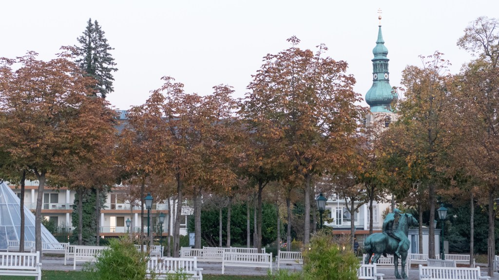 We go back to the room for down time and read for a couple of hours before going back out for a walk around town at sunset. Baden bei Wein is a health resort. We were here for a few days following a trip through Yugoslavia in 1988, though we can’t remember who actually recommended it. Back in those days we stayed for about 3 days at a 2 star pension, and now we are in a very nice 3 star hotel. I remember more about hiking in the Wienerwald than the town itself. It’s even wealthier than Graz (from our first impressions), with lots of gardens and beautiful homes and well-dressed people strolling the beautifully tended streets. The drought seems less severe here and the weather is cooler than what we’ve experienced in weeks.
