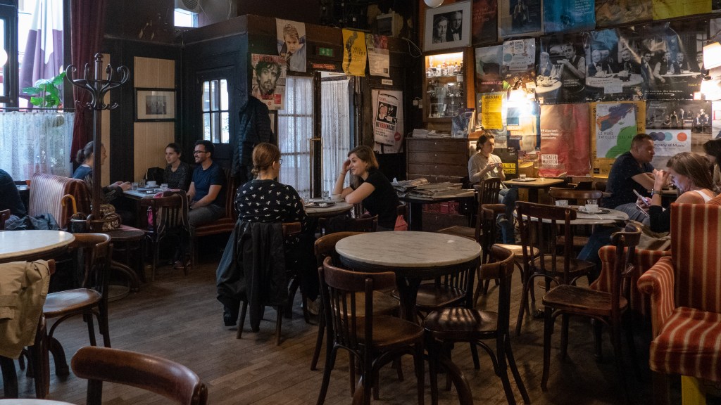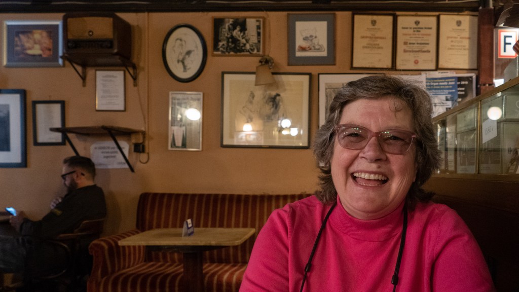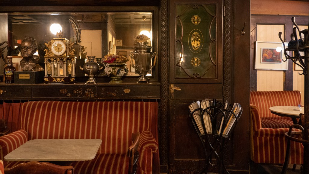We rode the tram to Vienna and were thrilled to be back at the opera.  Its Sunday morning so less people.  We had time to kill before our “timed” tickets and we went to Halweka café.  Many years ago, we were here with friends.   It is cool and we remember being thrilled imagining Trotsky plotting the revolution while drinking coffee.  We remembered a phone booth was along the wall.  When we left we looked for it.  We spotted the sign and boldly opened the door to see the small space junked with stuff but there was a phone in there!