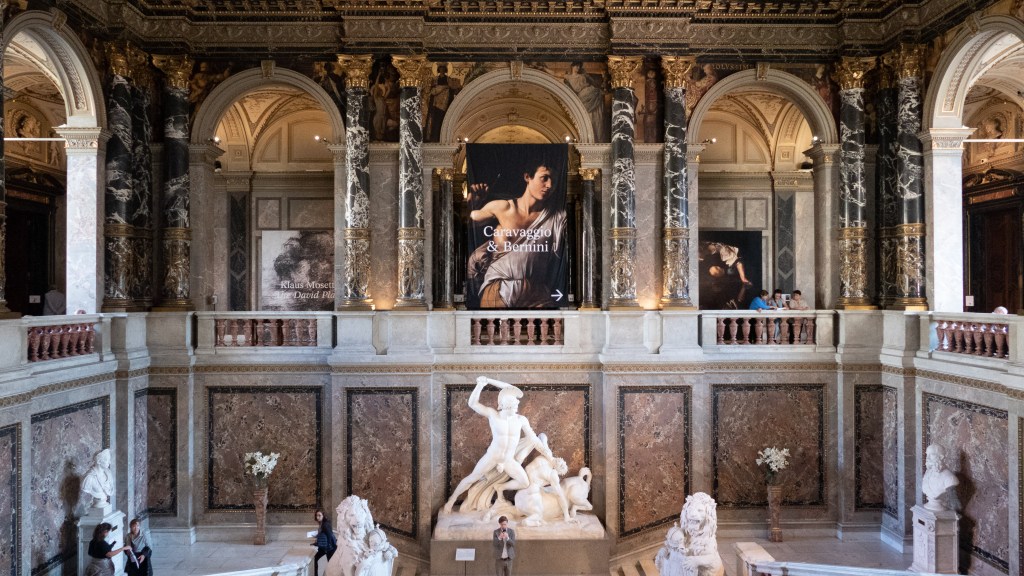 At the museum I feel the air leaving my body.  I yawn a lot.  Lorena says, look at he Bruegel.  I love it and can spend tons of time spotting the little details.  I think I want to see if there is a jigsaw puzzle of one of his works.  The building is incredible.  It has decorations painted by Klimt.  We finally get into the Caravaggio display at our designed time.  I look at Lorena across the room and she is crying.  Oh dear.  I like the seating they have in the galleries.  High backs.
