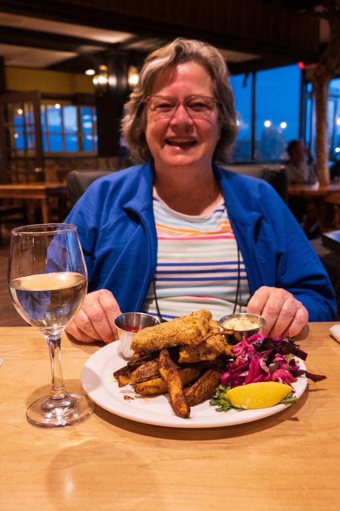 The hotel room is nice and as promised is on the seventh floor with a balcony overlooking the water. We head out almost immediately for the Ferry Terminal where we’d hoped to be able to buy dinner to go and get wine at the store, but we were too late and all that was closing. One restaurant, the Wooden Monkey, was still open. It had lovely views of the harbor. We had a nice sit down meal instead: Kitty had cod, I had a chicken sandwich. The fresh fish was beautifully prepared, and our waiter was exceptionally kind. The wine was welcomed. We finished by ten and made our way back to the hotel, feeling restored after our long day.
