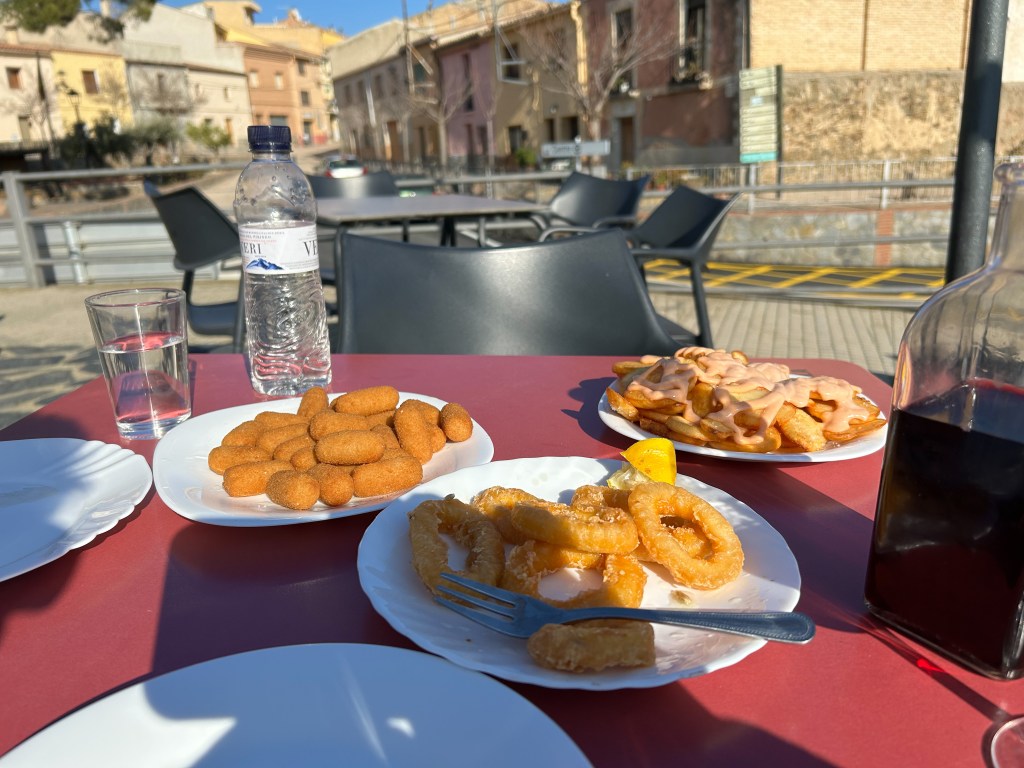 Ironically, our biggest challenge in the town was finding a bottle of wine. Everything seemed shut down on a Friday afternoon, and again the next night. We did find an open bodega that first afternoon and got two local bottles of Ònix wines (excellent) that lasted us the weekend. That first night the sunset was stunning. By Sunday afternoon things were starting to open across the town, and we came across restaurants and stores we hadn’t known existed. We spent our afternoon that last day at the local bar basking in the sun and eating bad, greasy tapas. I drank cheap wine that was still better than your average house wine. What a lovely stay at Gratallops!