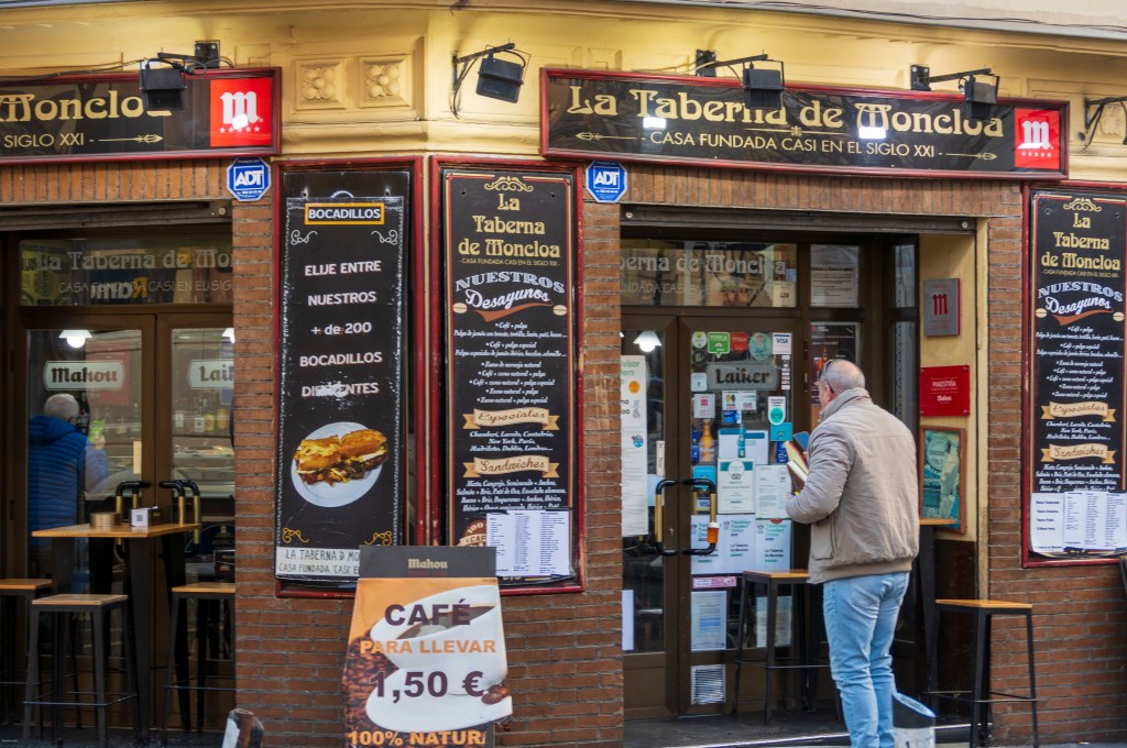 The birds themselves were great. We saw parakeets (Monks) and magpies, raptors, huge pigeons and unidentified others. No need for the bird blind as they seemed to make their way towards us. We worked our way across the park to the Edel Café. We shared a ham & cheese bocadillo and had a couple of coffees. Then it was back into the park past multiple monuments (including one to a slain trans woman) and into an adjacent neighborhood, Argüelles. We’d eyed a Japanese restaurant for lunch, but we were full from our sandwich. We thoroughly enjoyed wandering through the streets, and were both struck with how the neighborhood seemed to have maintained a lot of the traditional stores (hardware stores, food stores, local bars) that Barcelona has slowly lost through the years.