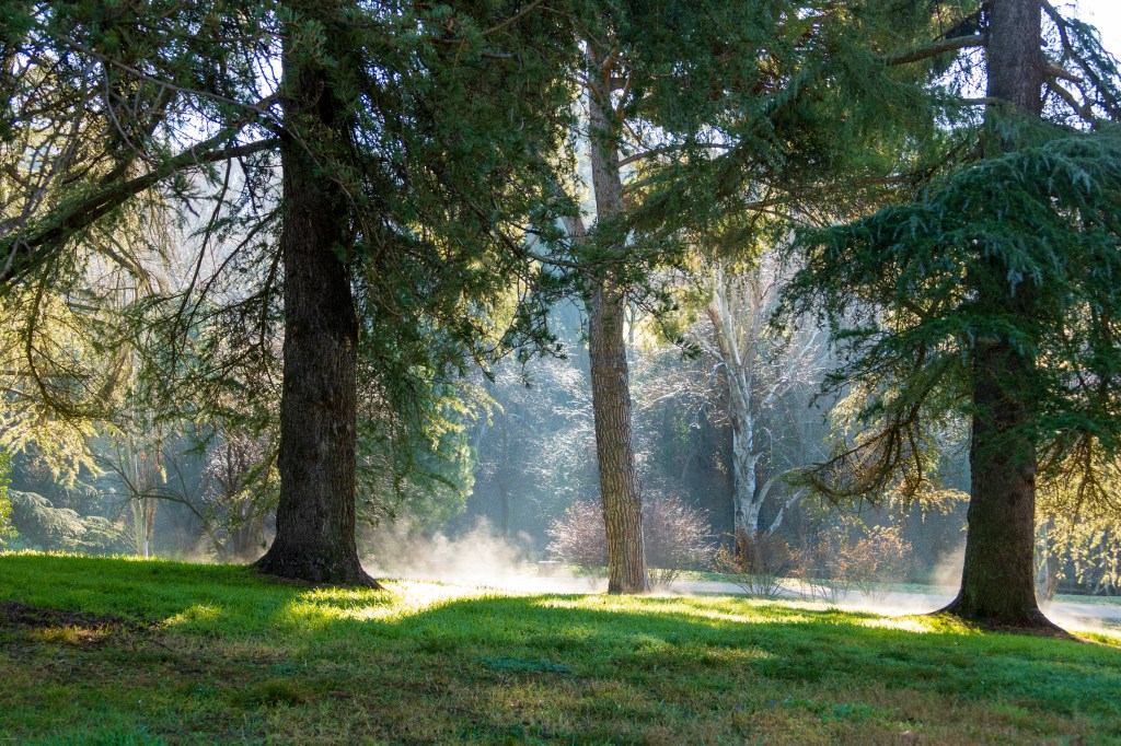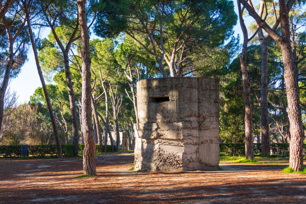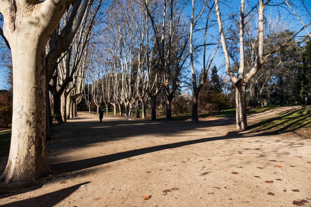 As we made our way past Moncloa and into the park, the sun came out and warmed things up. The frost evaporated in misty drifts. We walked down an allée lined with ancient plane trees and through trails enclosed with pines and spruce. I’d read of how the final days of the Civil War’s assault on Madrid had taken place here, but it was still sobering to see the old fortifications in place. We made our way past a disappointing and largely abandoned bird observation center consisting of aging signs, a padlocked blind and a pitched tent.