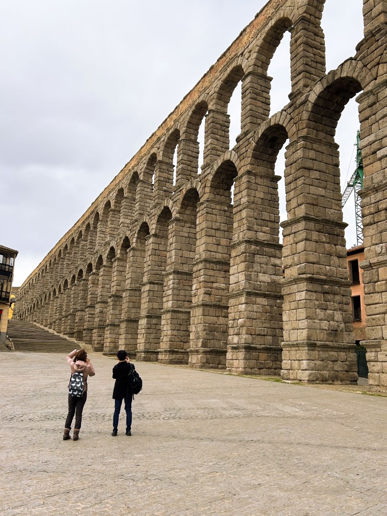 I took the fast train on the Salamanca route, and the journey was a scenic 30-minute ride (about €10 r/t). The rolling hills north of Madrid were decked with blooming almond trees and the Sierra de Guadarrama peaks were snow-capped. Arrival at Segovia Guiomar train station demands a bus ride (€2.00) either into town (#12) or to the Roman Aqueduct (#11). I opted for the aqueduct, a well-preserved and amazing architectural site well worth experiencing and a perfect gateway to the town.