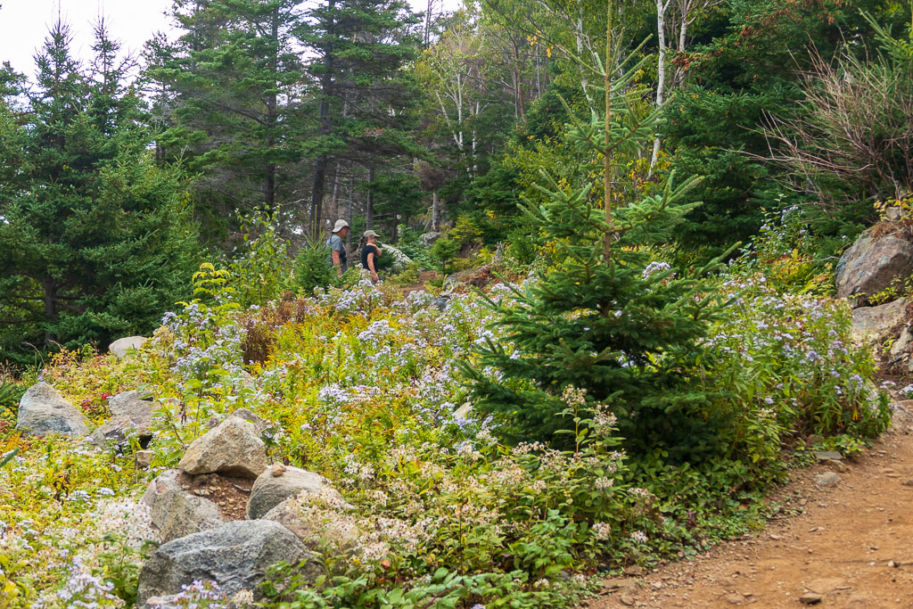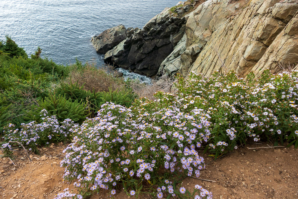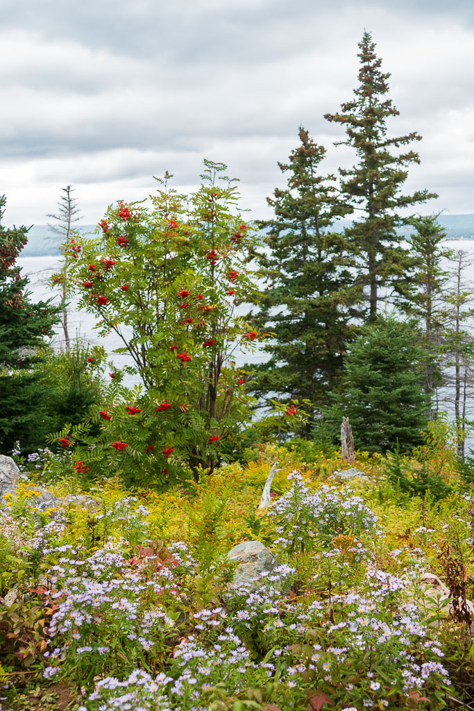 The trail heads down to the water and then rises up to the point with views of Cape Smoky and beyond. And even if the walk was challenging in parts, overall it was a stunningly beautiful walk, not only for the forest and water views, but the flora. We didn’t see seals or whales, but the wildflowers made up for it: purples and golds with fall colors all around against the deep green of the spruce and pines. After the hike, we headed up to Neil’s Cove and the Chowder House for lunch. Kitty & I shared the lobster BLT, Star got fried clams, and Mary seafood chowder with a biscuit. Delicious all around!