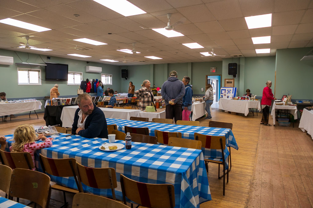 The next day Mary & Star are ready to find more hikes off the Cabot Trail. Kitty & I set off for a local farmer’s market at the North Cape Community Center. Parking is limited but we squeeze in a space. A man with coolers (fish?) is there at the door and Kitty asks “Are you selling fish?” but he is such a mutterer we can’t understand a word he says. We say our goodbyes and move on. There’s a small room to the right with vegetables, but the large room ahead draws us in with a variety of stuff for sale: baked goods, photos, books, nick knacks.