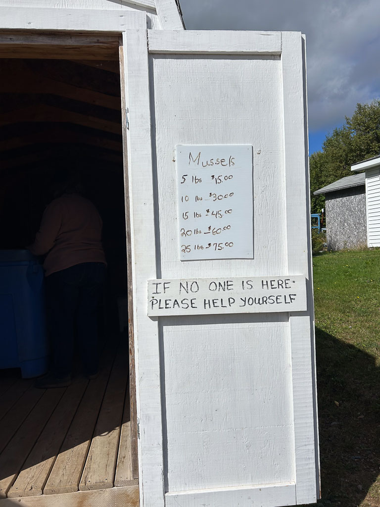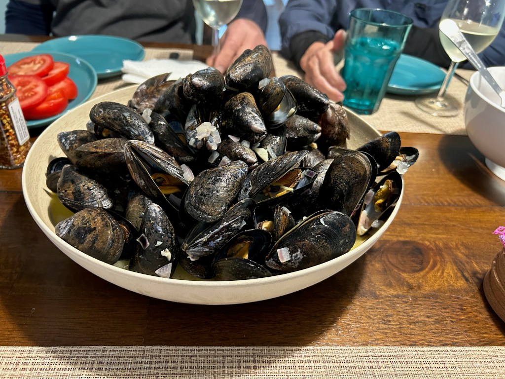 When we leave we see a sign about a block up the road for “Fresh Mussels.” We head that way and turn down a narrow lane, following signs to a shed. There is nobody there, but a sign instructs us to self-serve, choosing either 5 lb bags for homes or 20 lb bags for restaurants. The 5 pound costs $15.00, and ends up serving all of us handily at our evening feast.