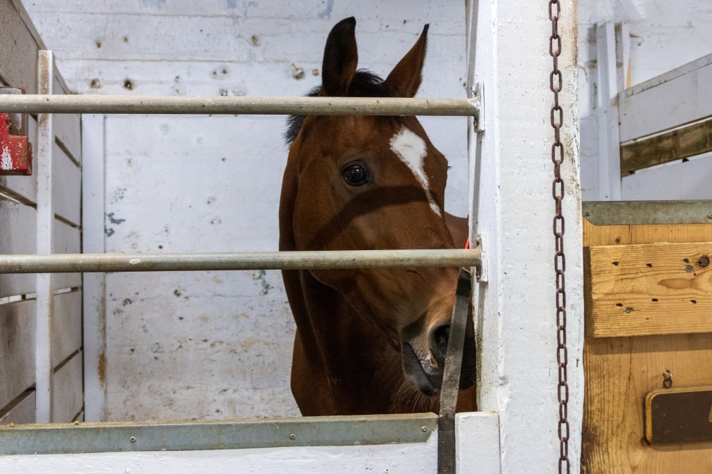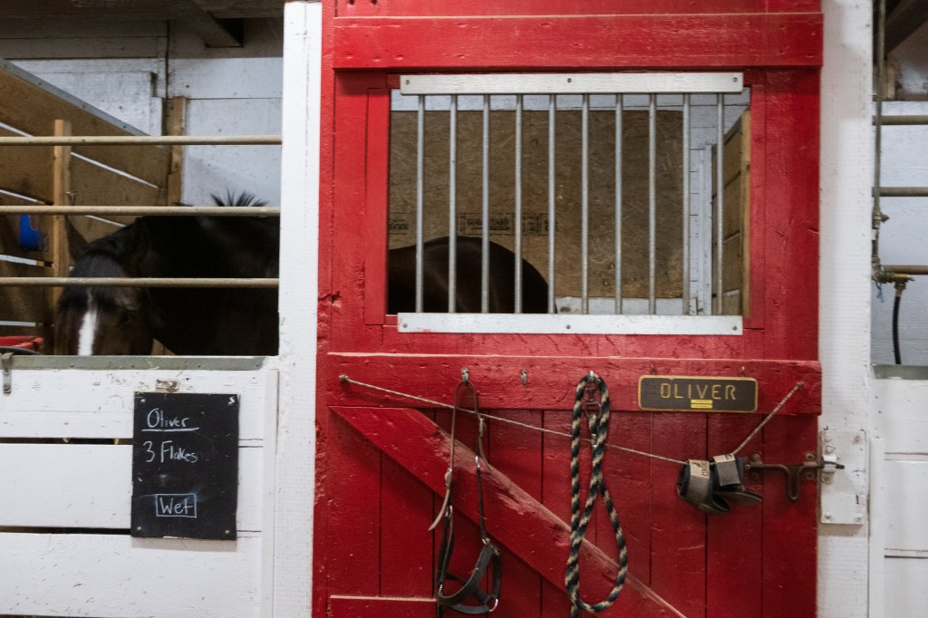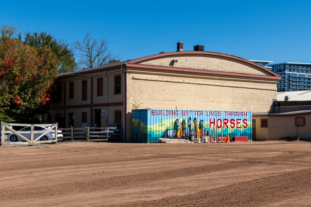 Exiting the mall proves to be a challenge, but we manage and are on our way when we pass a small dirt paddock with about five horses in it. Kitty calls them over with some grass and a sweet bay gelding comes over with his tongue hanging out. When we round a corner we find an urban stable, “The Halifax Lancers.”