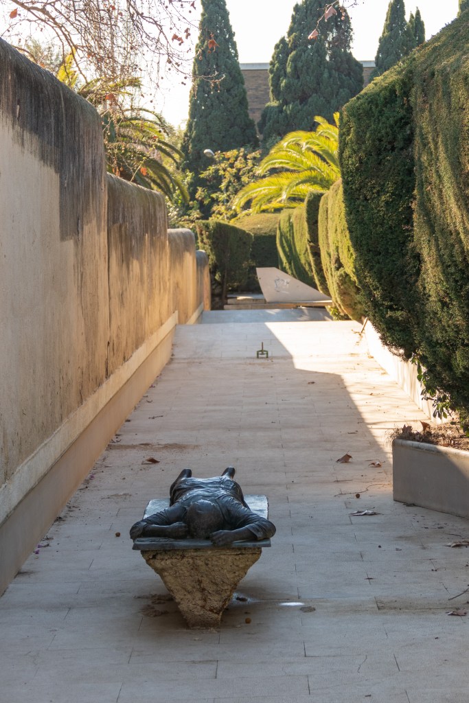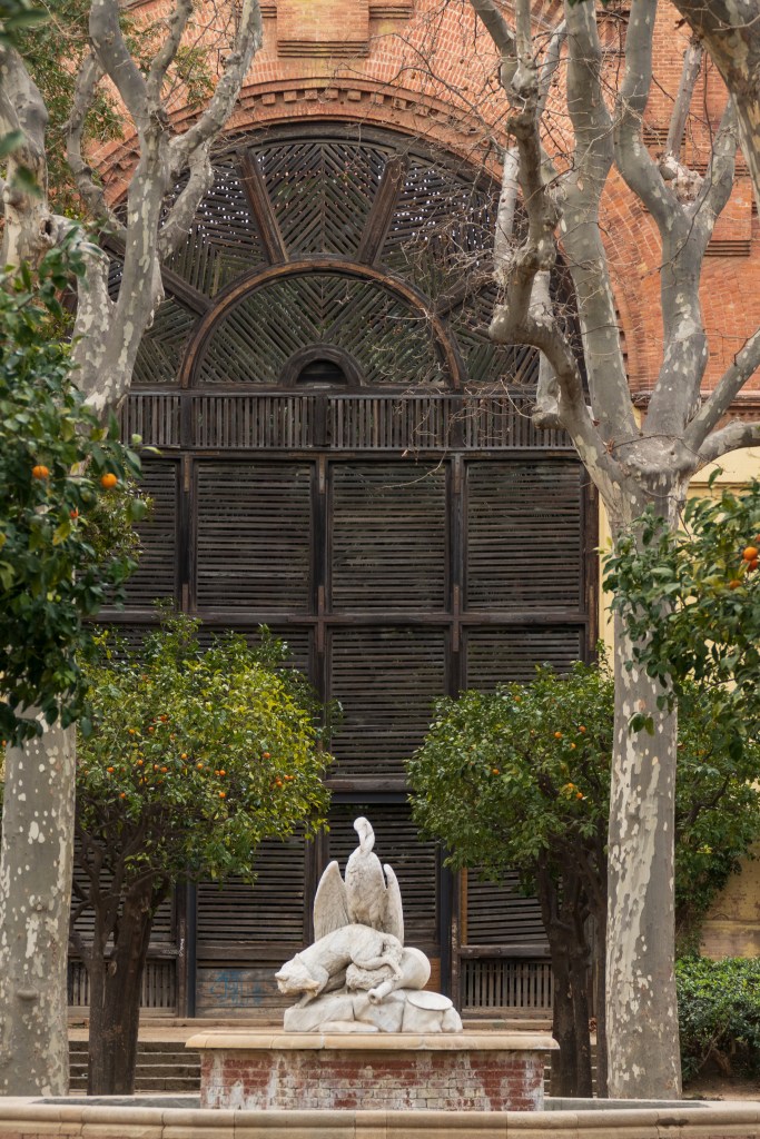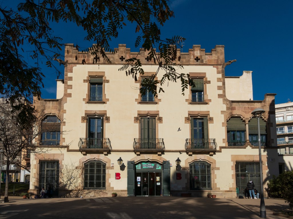 Barcelona’s parks continue to attract us with their quiet spaces, city views, statuary, flora and fauna. There are always birds and dogs, and the Mediterranean plants are largely different and diverse. Even the small parks often have dog parks and children’s play area. The building below is a youth center.